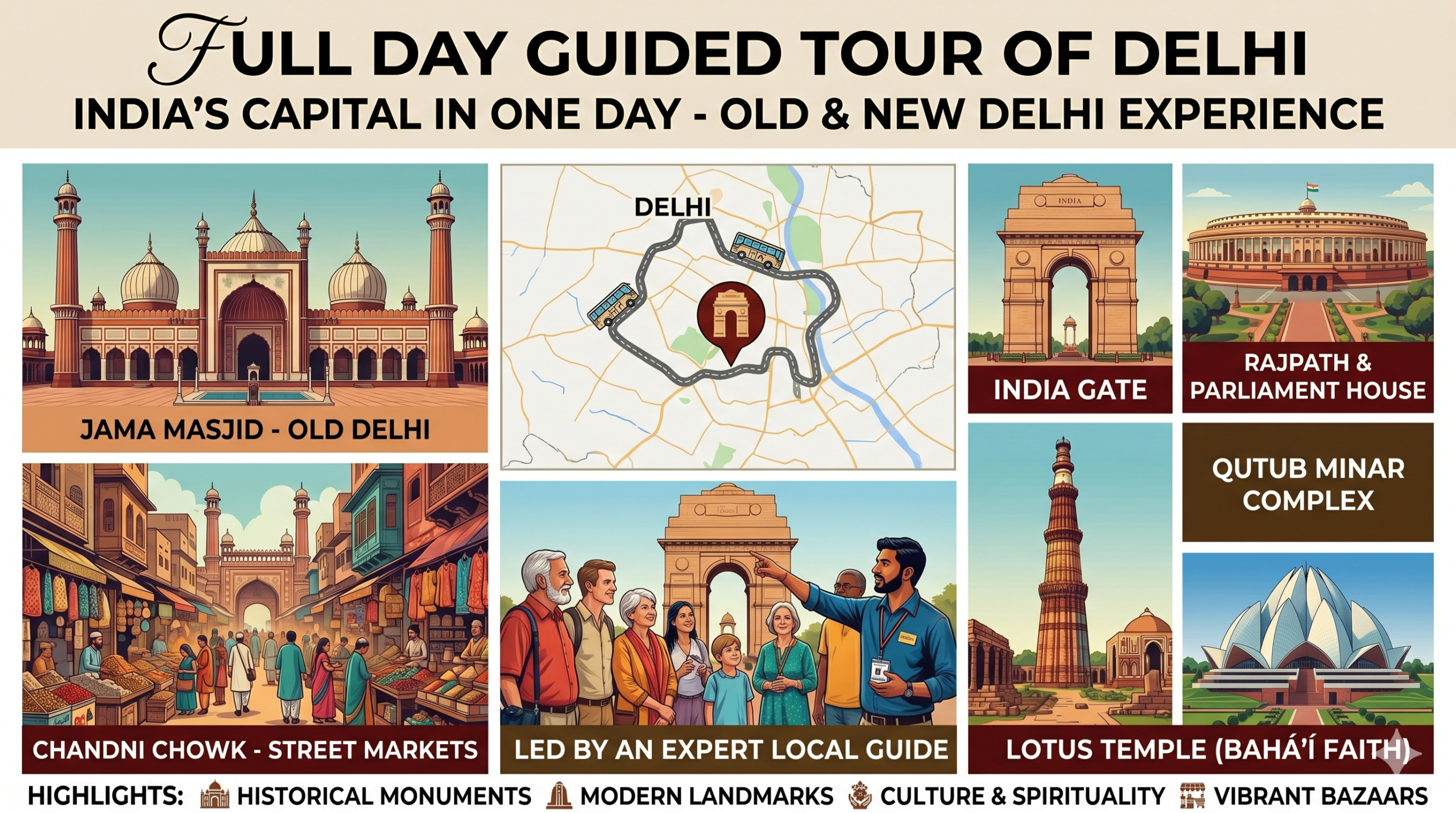 Full Day Guided Tour of Delhi – Explore India’s Capital in One Day Discover the rich history, culture, and architecture of Delhi on this immersive full-day guided tour. From Mughal-era monuments to modern political landmarks, experience the perfect blend of Old and New Delhi in one unforgettable journey.